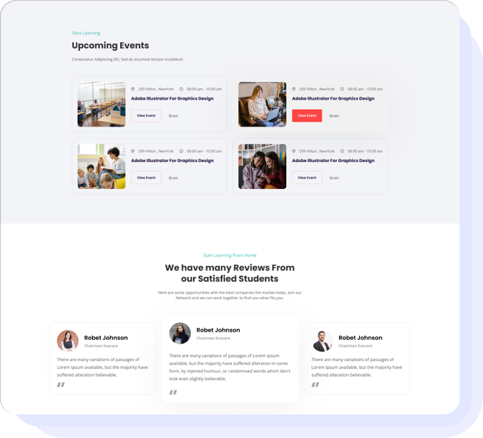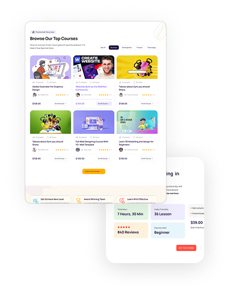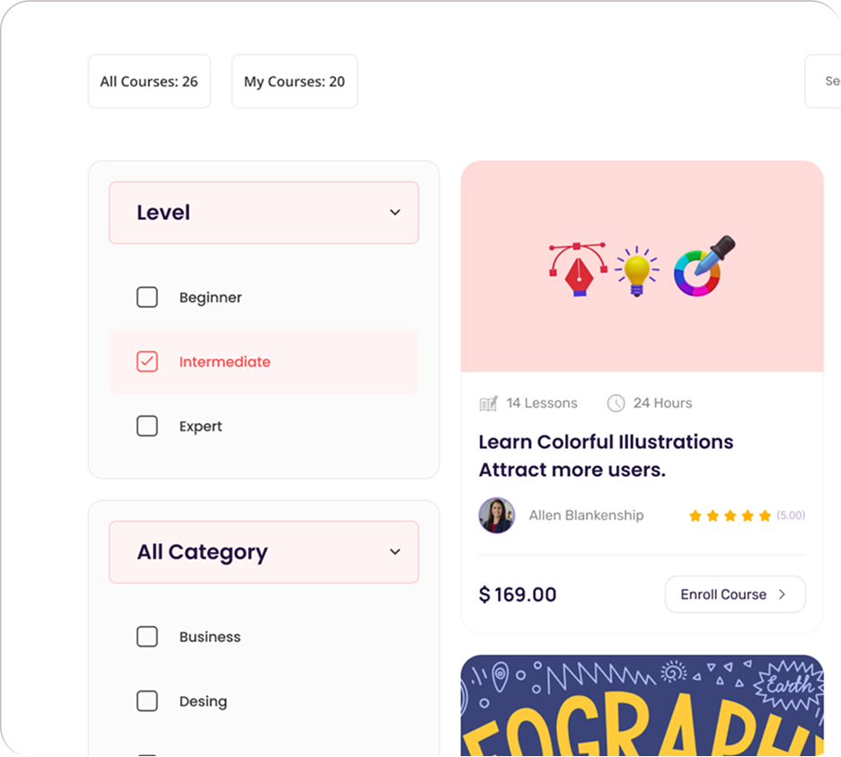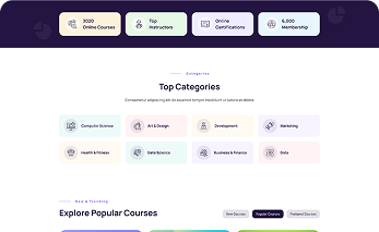 Showcase your courses beautifully with multiple layout styles, including grid, list, category-based, and detailed single course pages.