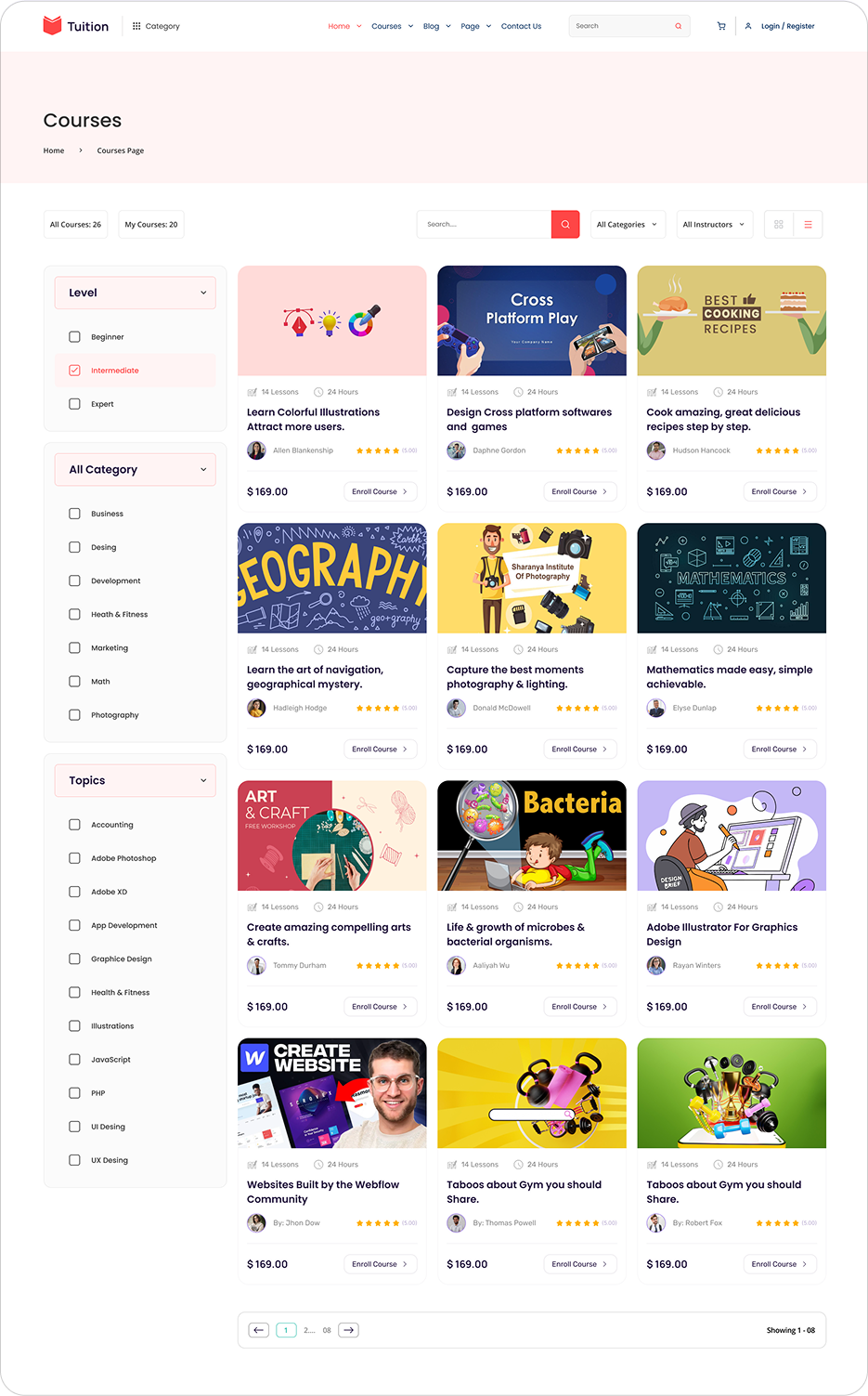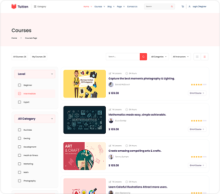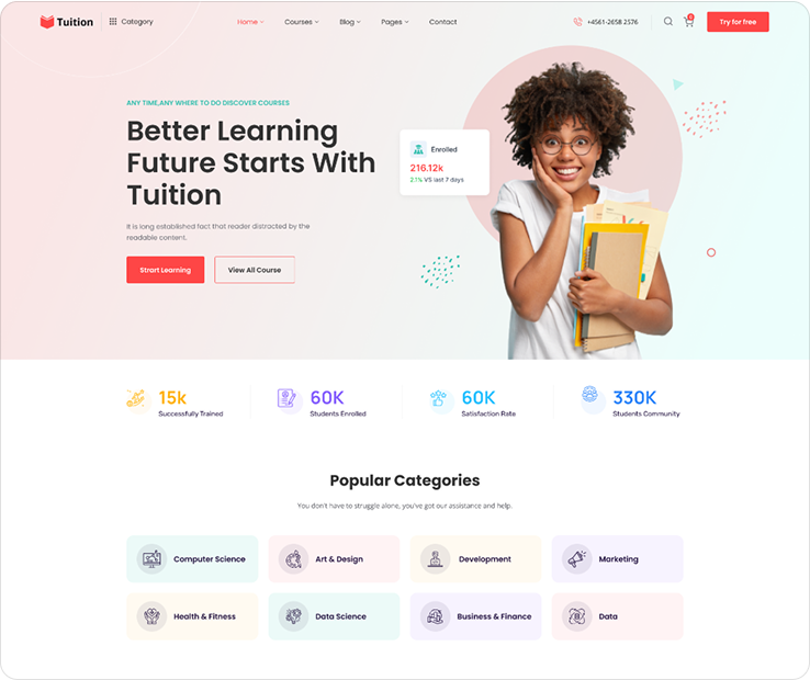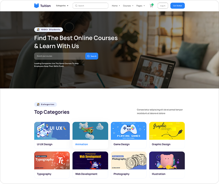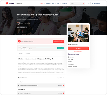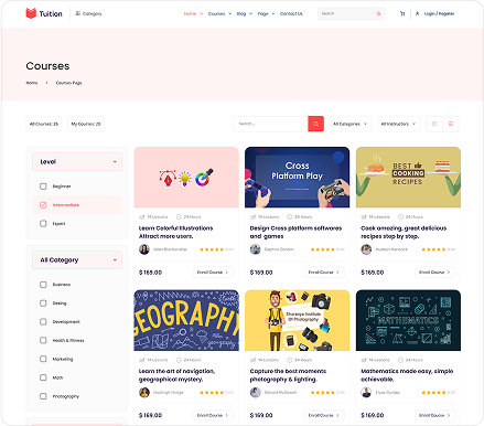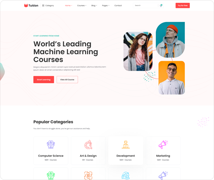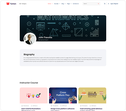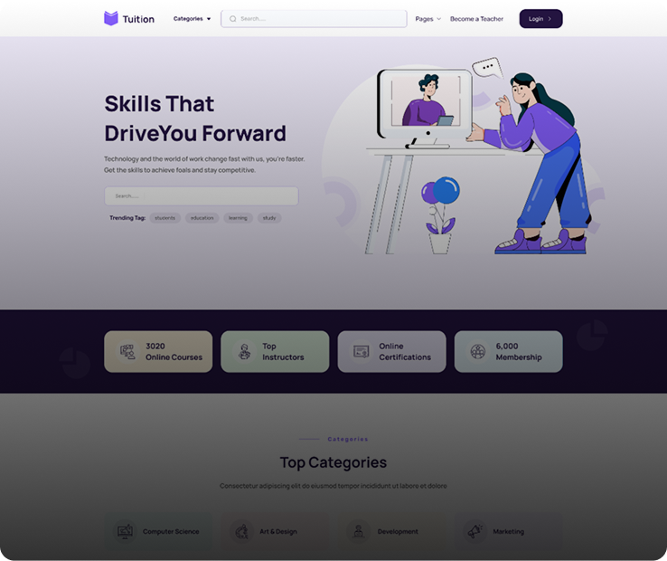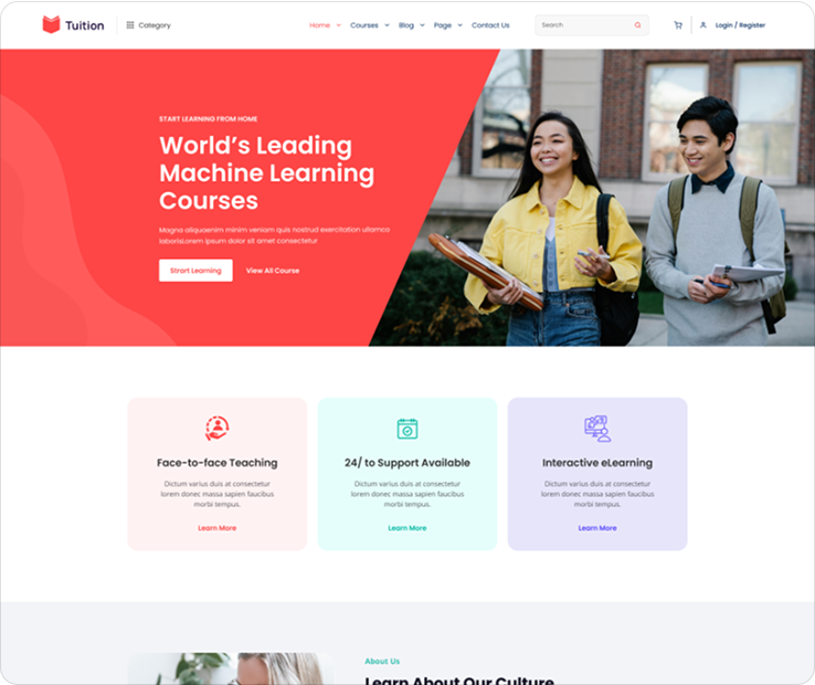 Look for an elegant and budget-friendly LMS ( Learning Management System) Wordpress theme to create yo educational website? The Tuition - Education & Online course Wordpress Theme is you perfect solution. With stunning animations, Creative design patterns, and fully responsive code Tuition is built with Eliminator and offers seamless integration with WooCommerce, Zoom, Event Management, MailChimp , Contact Form &, AXF Redux Framework, One Click Demo Import, GDPR Compliance, WPML Toast SEO, Cookie Notice, And More.
