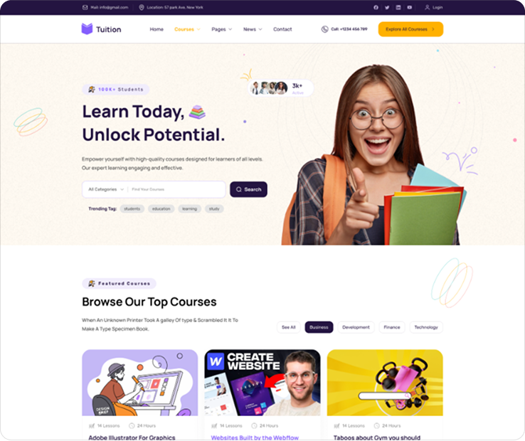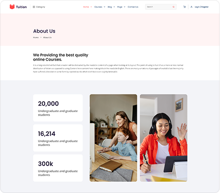 Tuition features 20+ homepages, 10+ headers, 10+ footers, and 30+ unique inner pages—perfectly crafted for educational websites.